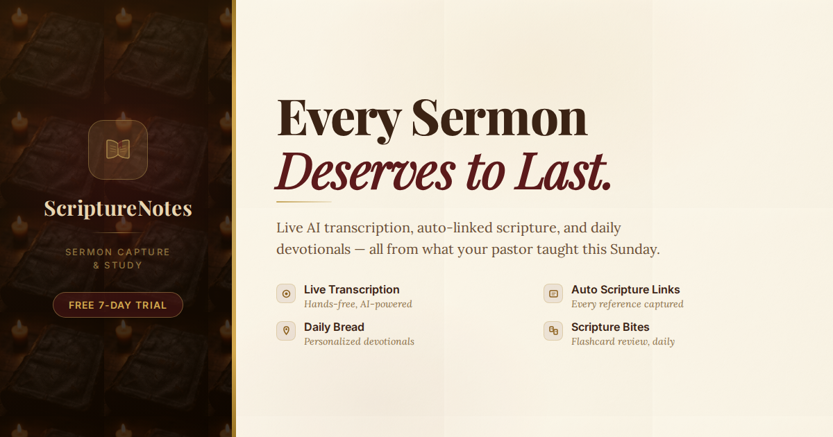 "The gap between what gets said from the pulpit on Sunday and what actually sticks by Tuesday is enormous. I built ScriptureNotes because the sermon deserves to outlast the weekend."